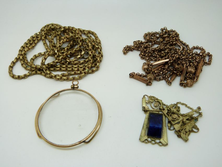 Two gilt watch chains, a necklace set with lapis lazuli etc