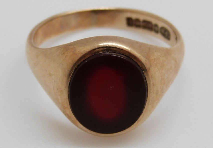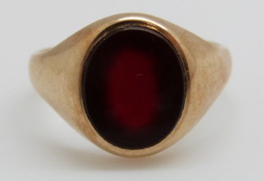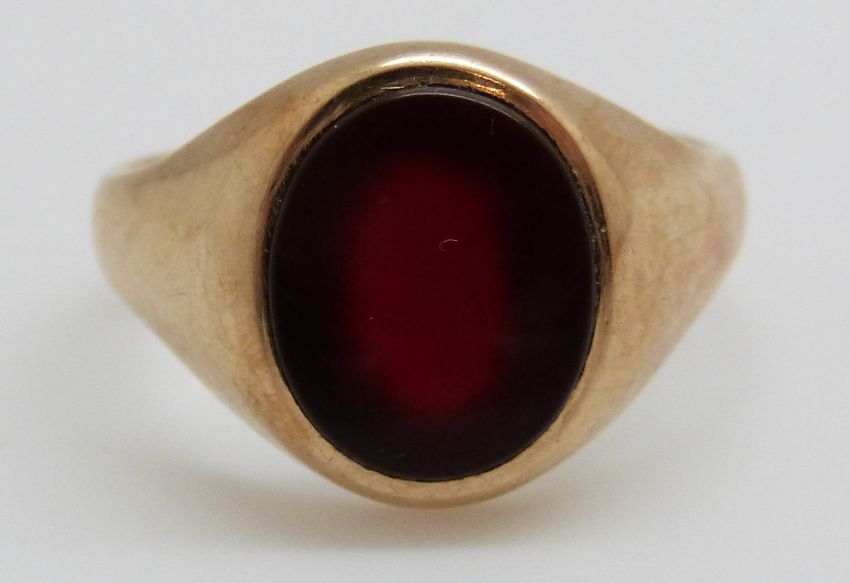 A 9ct gold signet ring set with agate and a yellow metal ring, 6.4g