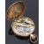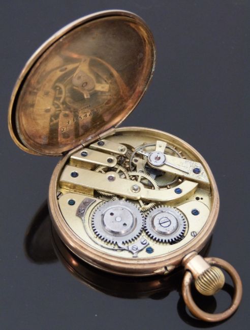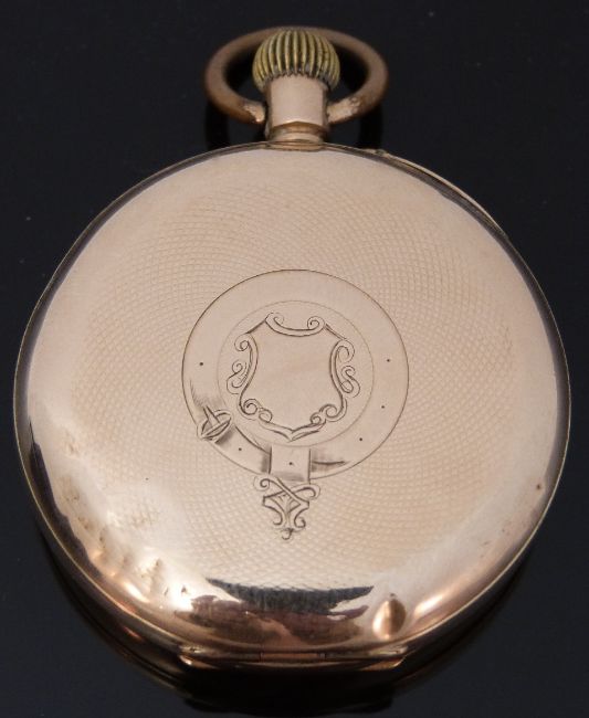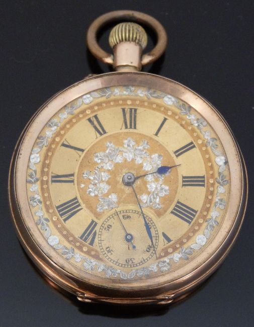 Continental 14ct gold keyless winding open faced gentleman's pocket watch with self coloured dial and silver floral decoration, subsidiary seconds dial, Roman numerals, blued hands and engine turned case, case diameter 48mm, 82.4g.