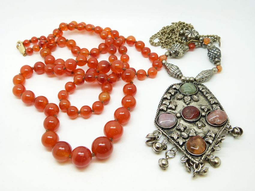 A graduated beaded carnelain agate necklace and a white metal necklace set with rose quartz, carnelain and other agate