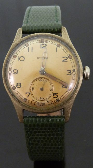 Buren gentleman's stainless steel military wristwatch with inset subsidiary seconds dial, skeleton hands and Arabic numerals and champagne face, stamped to the case back 'A.T.P. 143048' below ministry broad arrow, on green lizard calf leather strap, case diameter 31mm.