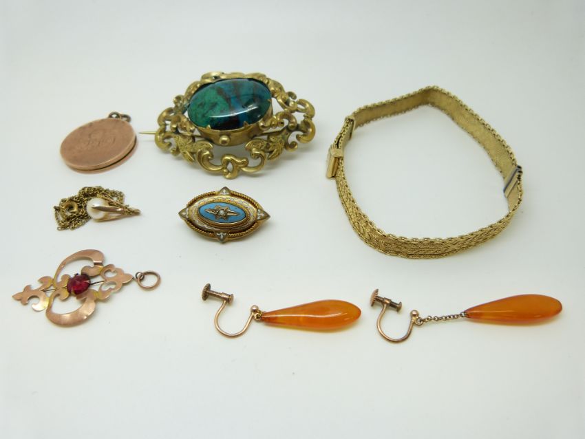 A 9ct gold pendant set with a faux pearl, Victorian brooch, 9ct gold pendant and 9ct gold locket