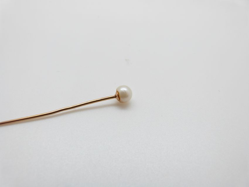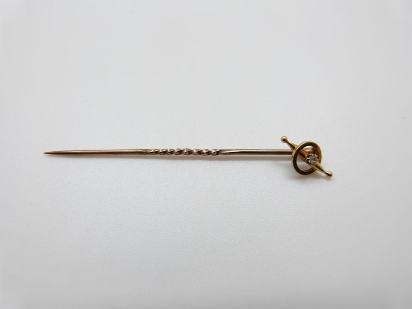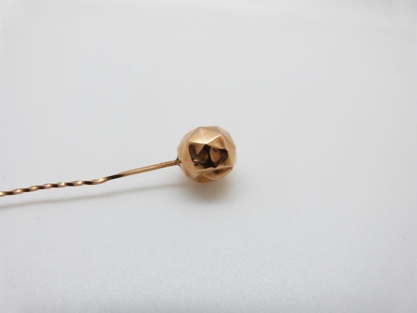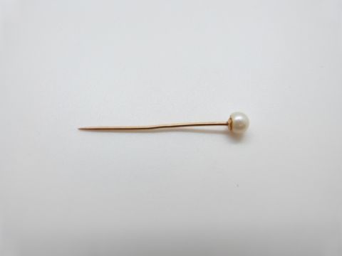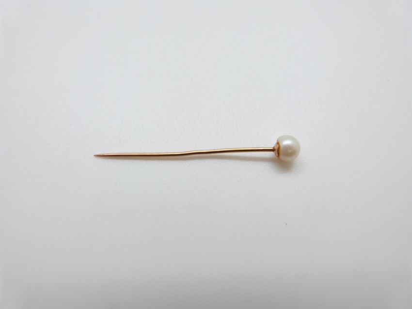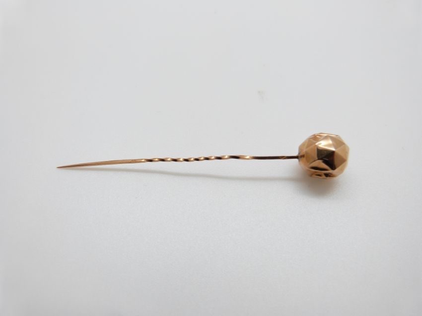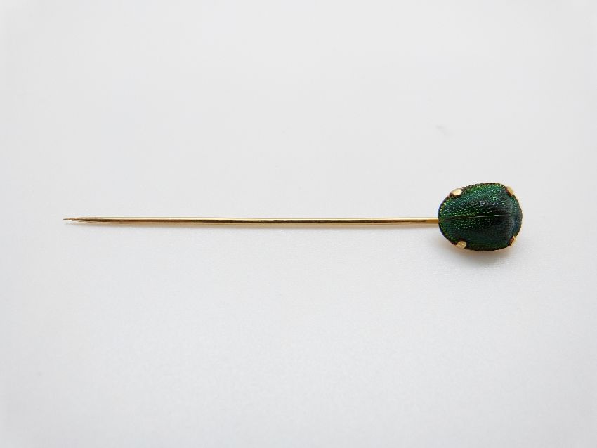A Victorian stick pin set with a scarab beetle, a Victorian gold stick pin set set with a faceted sphere, a pearl set stick pin and a 15ct gold stick pin set with a diamond