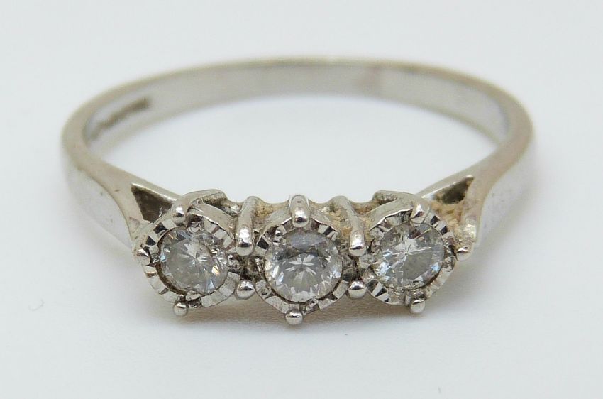 An 18ct white gold ring set with three diamonds, total diamond weight 0.25ct (size O)
