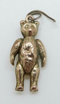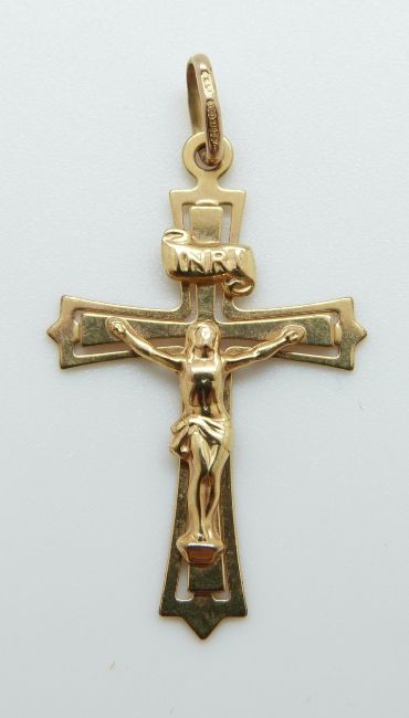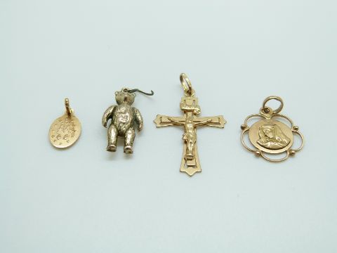 A 9ct gold teddy bear pendant, a 9ct gold cross pendant and two 9ct gold religious pendants, 4.9g