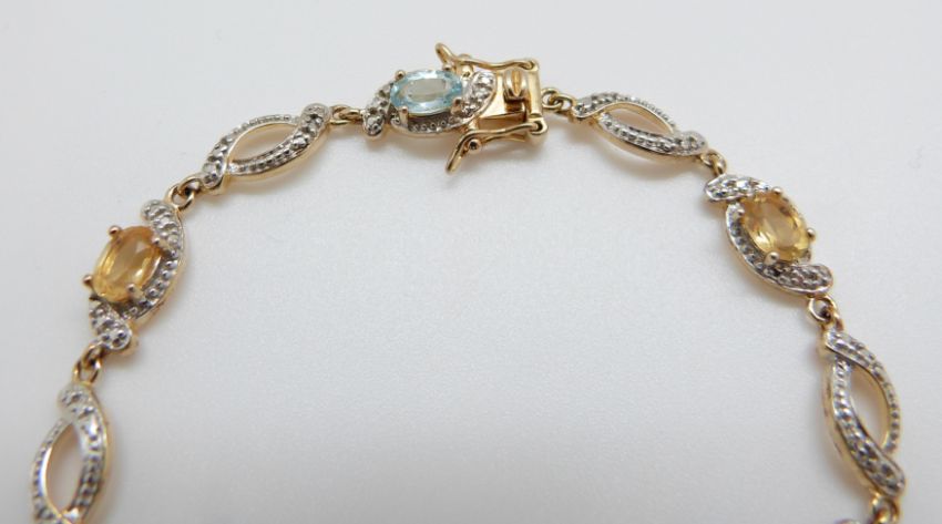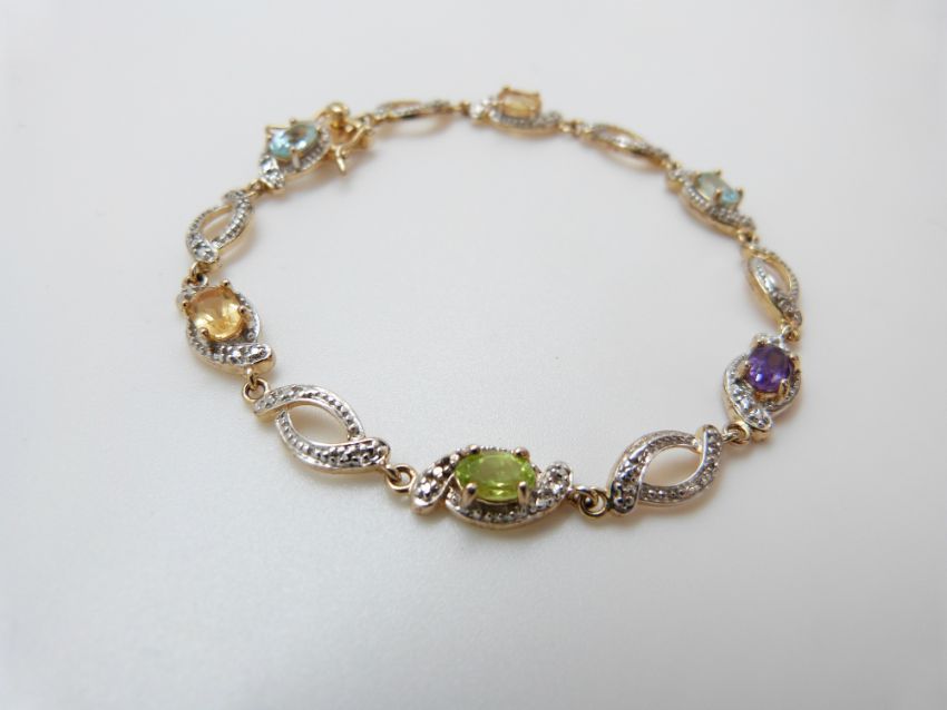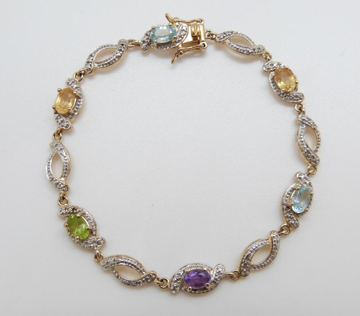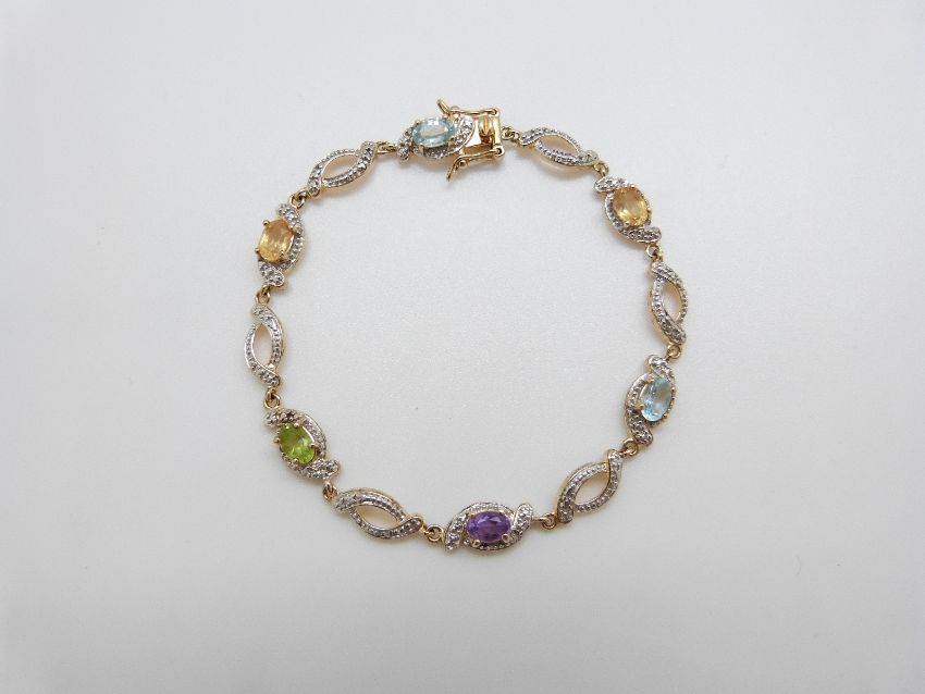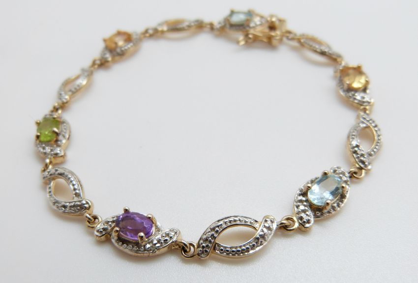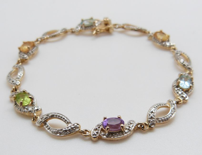 A 9ct gold bracelet set with diamonds and various gemstones, 9.6g