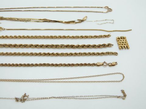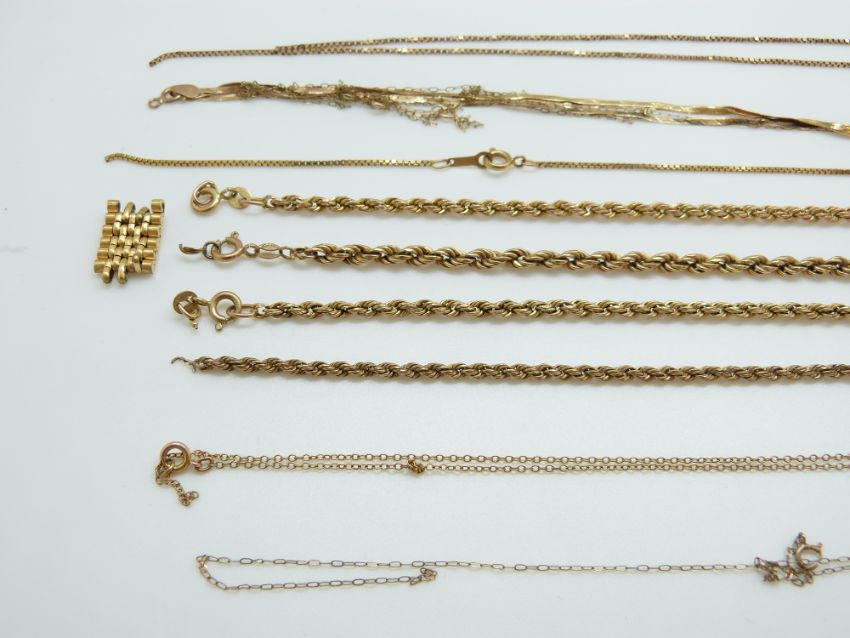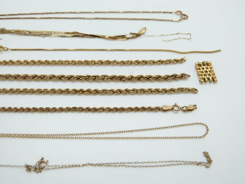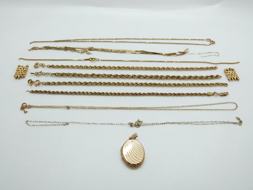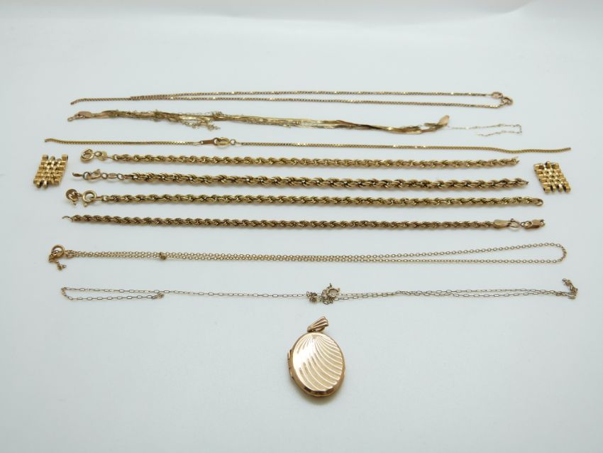 A collection of 9ct gold chains and a 9ct gold locket, 23.1g