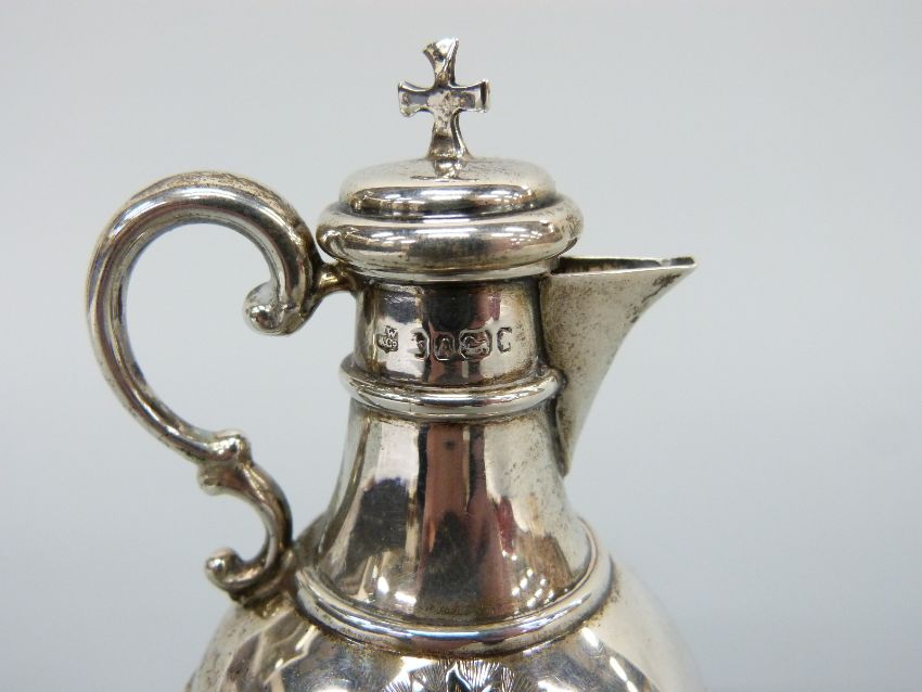 A Victorian hallmarked silver ecclesiastical pedestal wine jug, with cork top and cross surmount, Sheffield 1844, maker's mark TW & Co., height 10.5cm, weight 70g