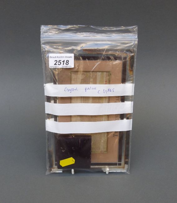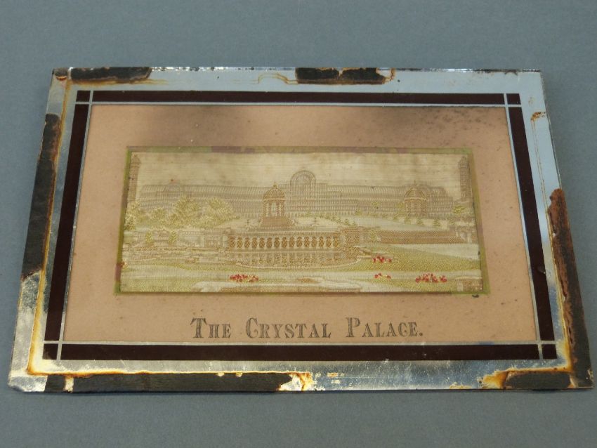An 1884 cased silver plated medallion by Pinches issued to commemorate the opening of The Crystal Palace, the obverse depicting a view of the palace, the reverse with bare breasted Britannia opening the doors of science and industry, together with a framed stevengraph of the Crystal Palace, label verso on both items