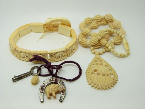 A carved ivory bracelet depicting elephants and an ivory necklace