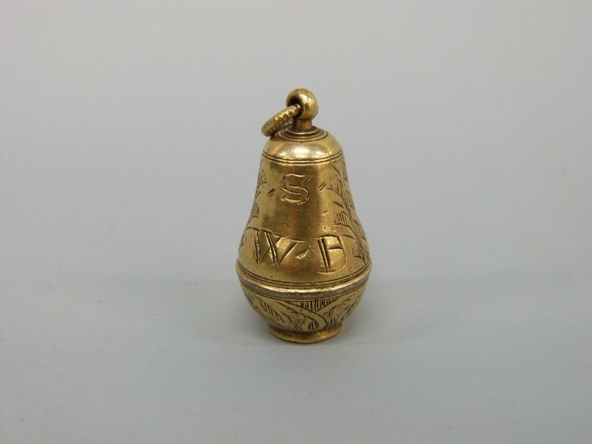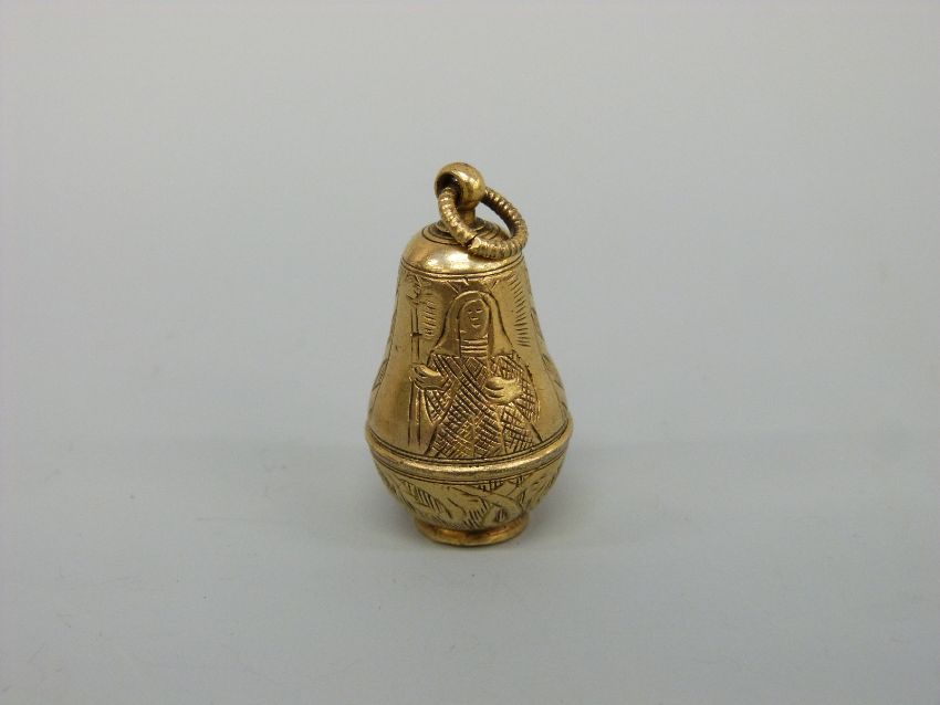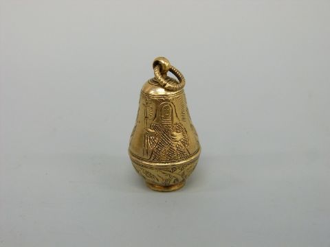 An exceptionally rare 17thC gilt metal pedestal pomander or spice holder with rope twist suspension loop and engraved decoration of a king, possibly Charles I, and the initials SWB, 3.8cm