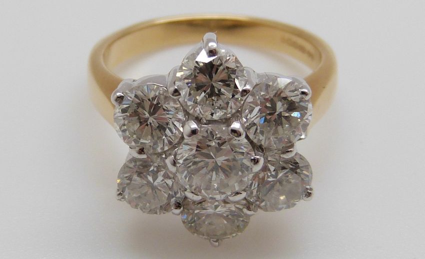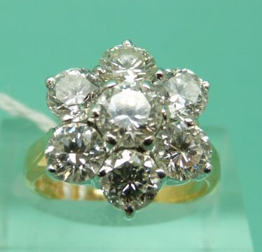 An 18ct gold ring set with seven round brilliant cut diamonds, the centre stone measuring approximately 0.8ct surrounded by six diamonds in a cluster, each approximately 0.5ct (size L)