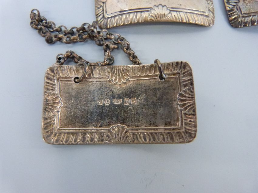 A harlequin set of 19thC hallmarked silver bottle tickets comprising Sherry (Birmingham 1922), Port (London 1822) and Madeira (Birmingham 1833)