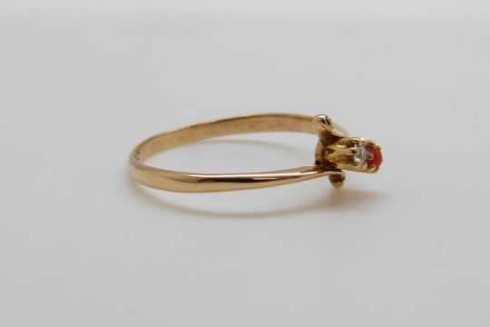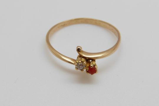 A yellow metal ring set with a diamond and a coral cabochon (size T)