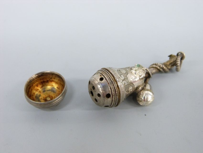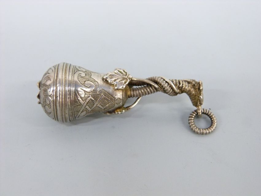 An exceptionally rare early 17thC white metal pendant vinaigrette with screw top and attached acorn shaped filler with naturalistic suspension loop, 5.5cm