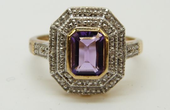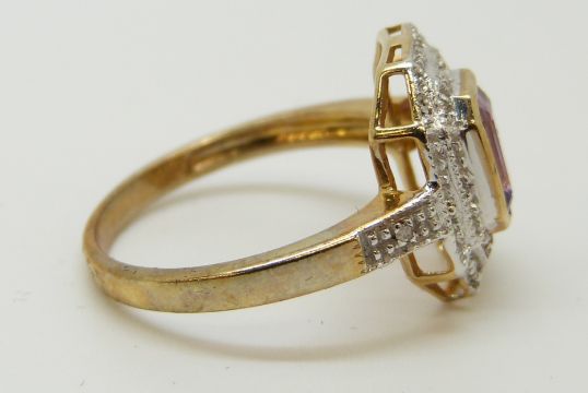 A 9ct gold ring set with an amethysts and diamonds (size M)