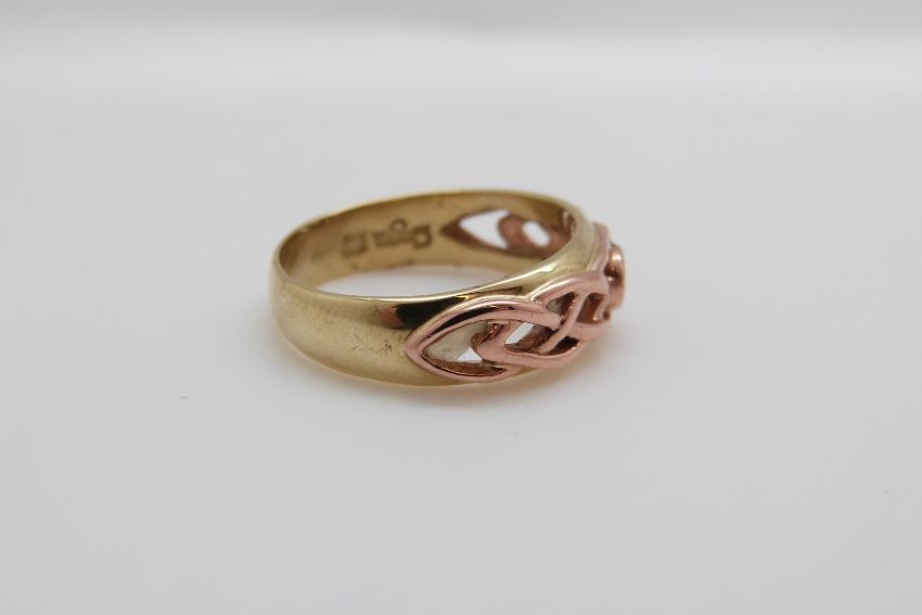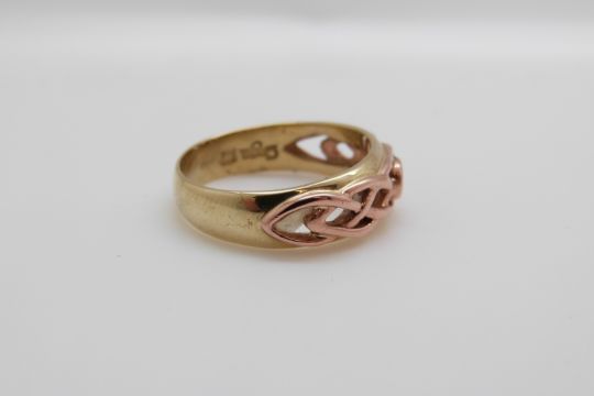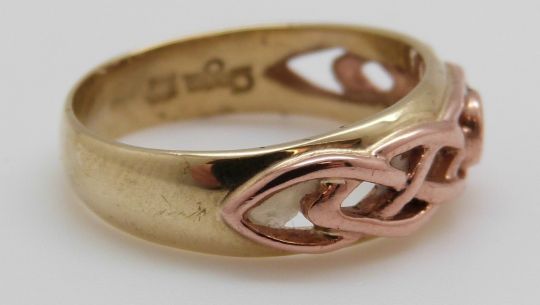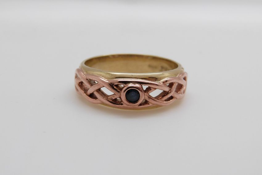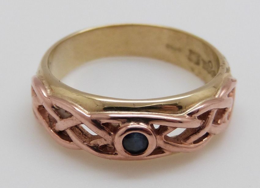 A 9ct gold Clogau ring set with a sapphire in a pierced setting (size O/P)