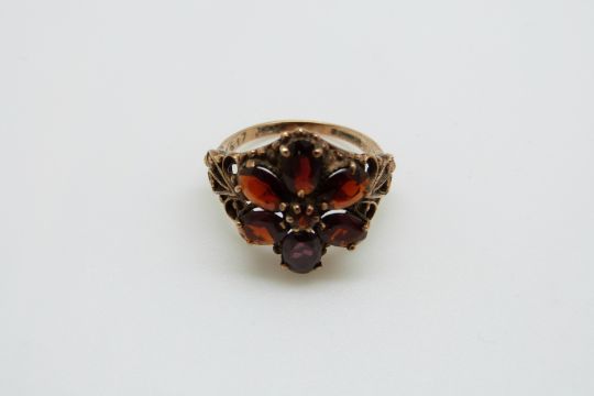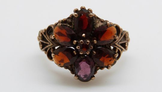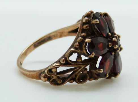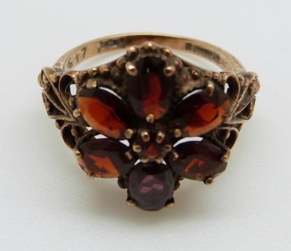 A 9ct gold ring set with garnets in a large flower cluster, 4.1g, size M