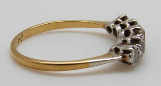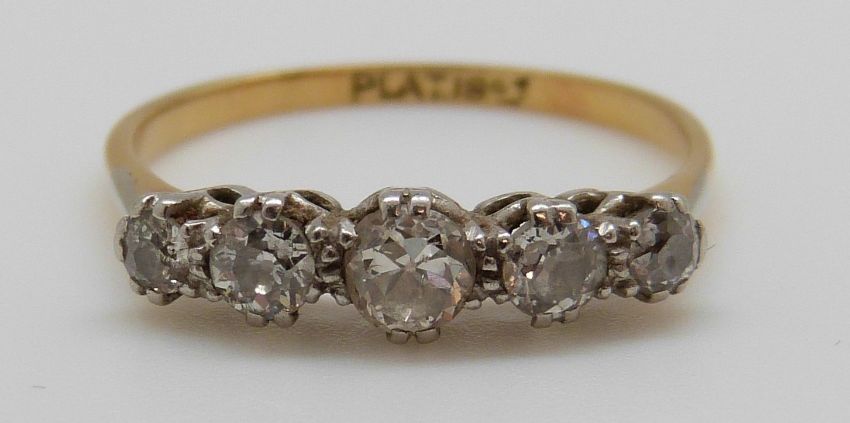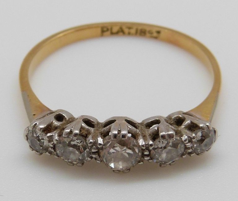 An 18ct gold ring set with five diamonds in a platinum setting, largest diamond approximately 0.2ct (size P)