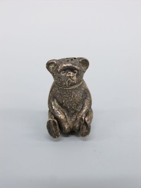 A George V hallmarked silver novelty pepper formed as a teddy bear, Birmingham 1908 maker Henry Charles Freeman, height 4cm, weight 5g