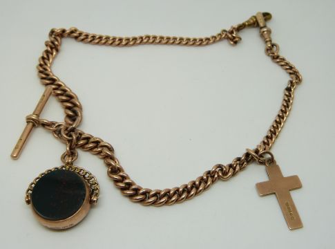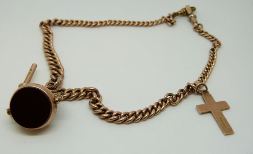 A 9ct gold double Albert/ watch chain with a 9ct gold swivel fob and 9ct gold cross, 39.2g
