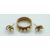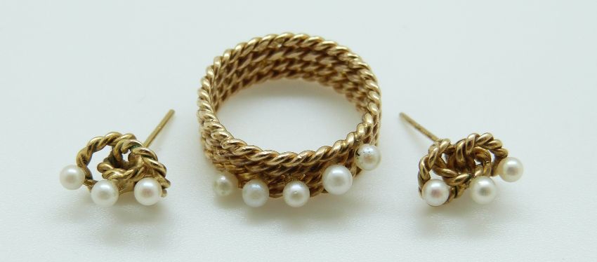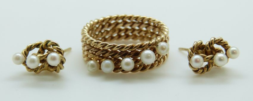 A 9ct gold textured ring set with three pearls, by Hopper Bolton, with matching earrings, 7.2g
