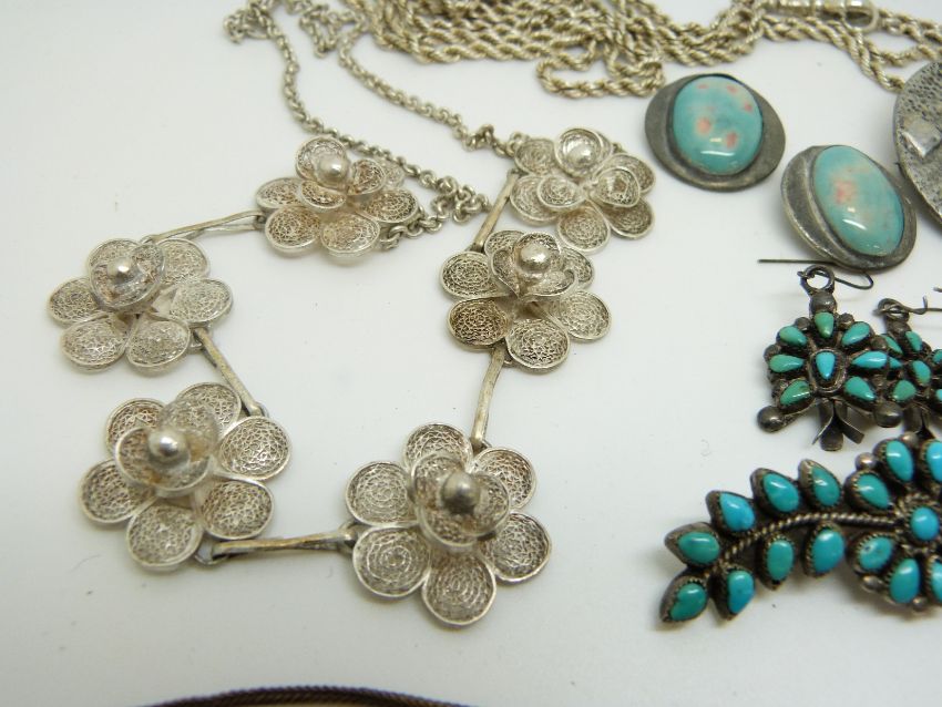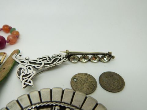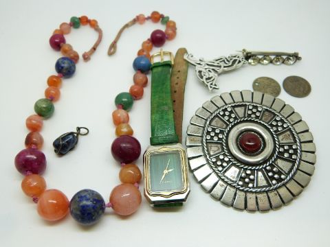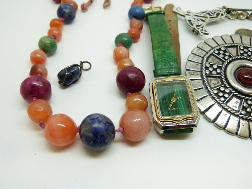 A beaded necklace made up of agate and lapis lazuli, pewter brooch, silver brooch, Victorian paste brooch, etc