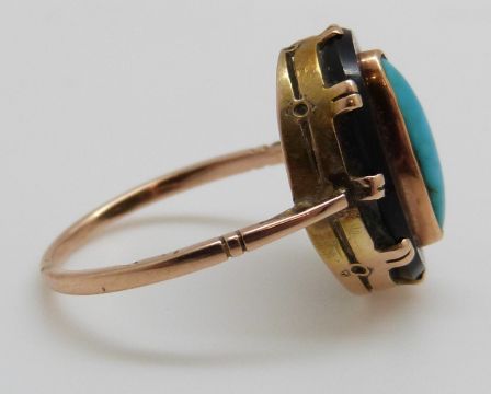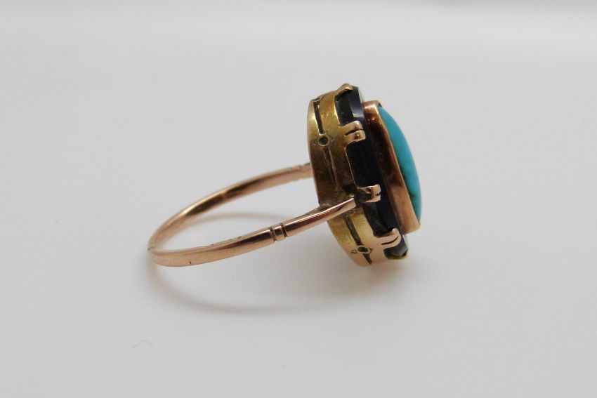 A yellow metal ring set with black onyx with a turquoise to the centre (size M)