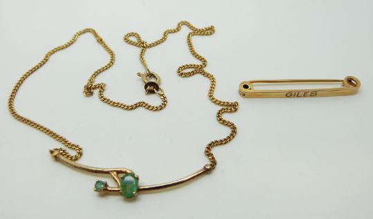 A silver gilt necklace set with oval emeralds and a 9ct gold brooch