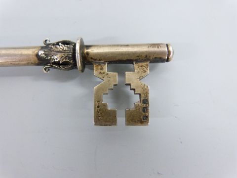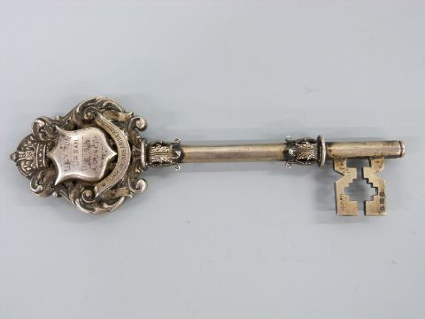 A hallmarked silver presentation key engraved with Leyton Urban District Council presented on the opening of Canterbury Rd School, architect William Jaques Ariba, Birmingham, 1909, maker's mark W. LD, length 13.5cm, weight 87g