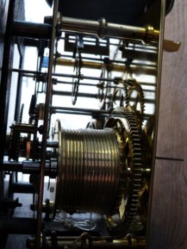 William Herbert of Ludlow, mid 19thC 8 day duration longcased clock, the 13inch painted Arabic dial with secondary seconds and date aperture, maker's name below floral and foliate decoration to corners, depiction of Belshazzars Feast to arch. Matching brass filigree and chased hands. The oak case with banded and reeded decoration and quarter columns, the door and base panel with shell inlay design, the hood with swan neck pediments and brass finials, 234cm tall including finials