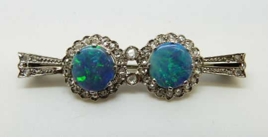 An Art Deco 9ct white gold brooch set with two opal doublets surrounded by rose cut diamonds, 4.9cm, 4.8g