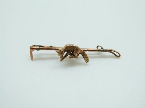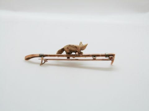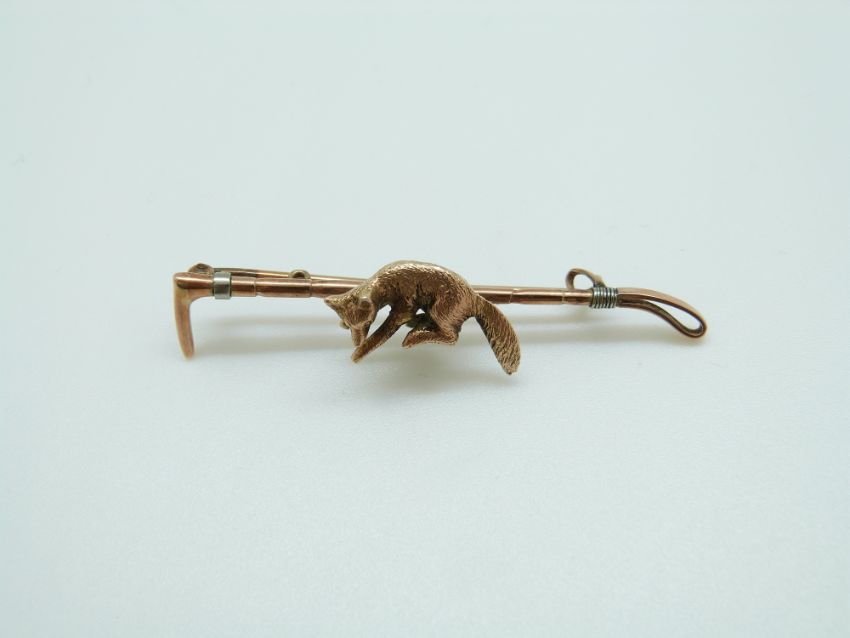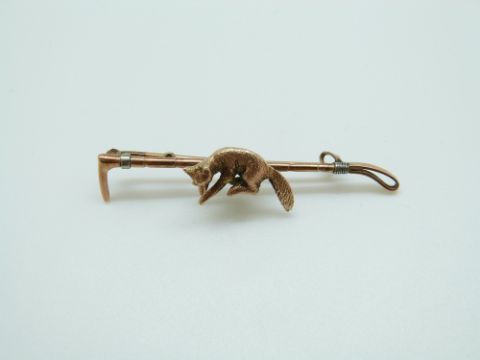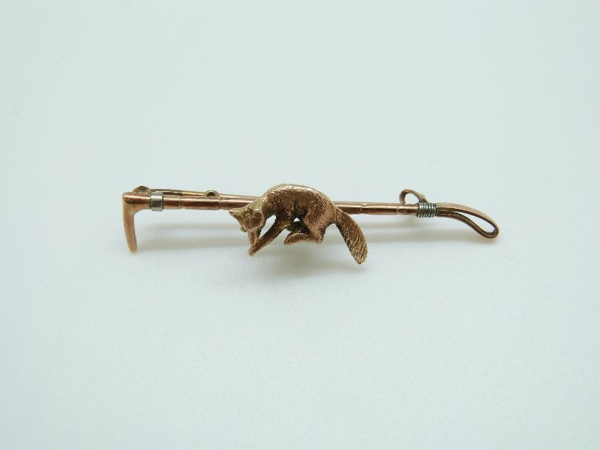 A 9ct gold brooch in the form of a fox and whip with textured detail, in Hong Kong box, 51cm, 4.5g