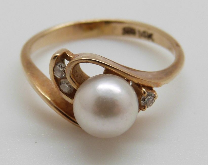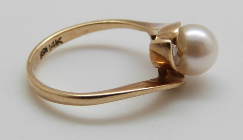 A 14ct gold ring set with a pearl and diamonds, 2.5g, size J