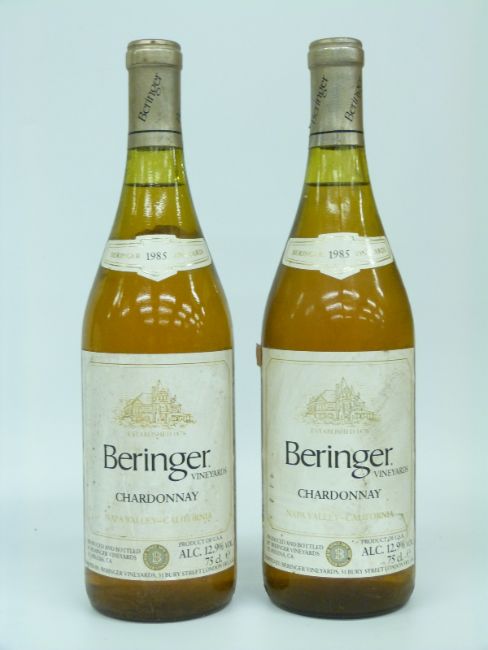 Five bottles of wine comprising two bottles of 1985 Beringer Chardonay, two bottles of 1966 Chateau Foureau and a bottle of 1999 Chateau de la Colline, all 75cl