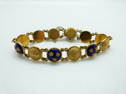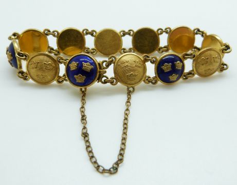A Swedish gilt bracelet set with circular links depicting three crowns to each with alternating blue enamel ground