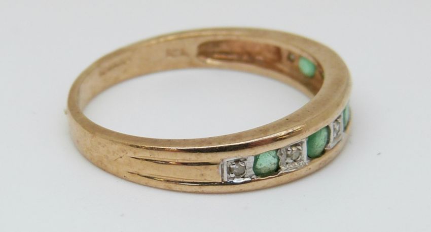 A 9ct gold ring set with alternating emeralds and diamonds (size P)