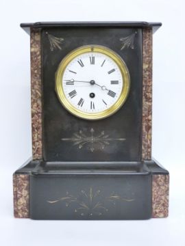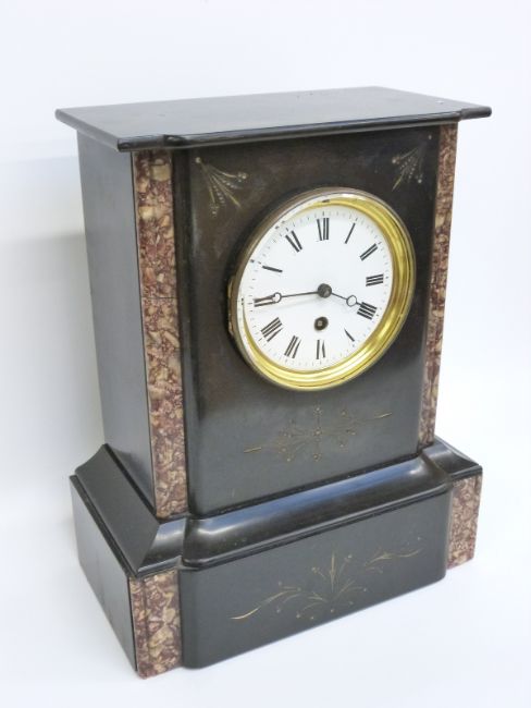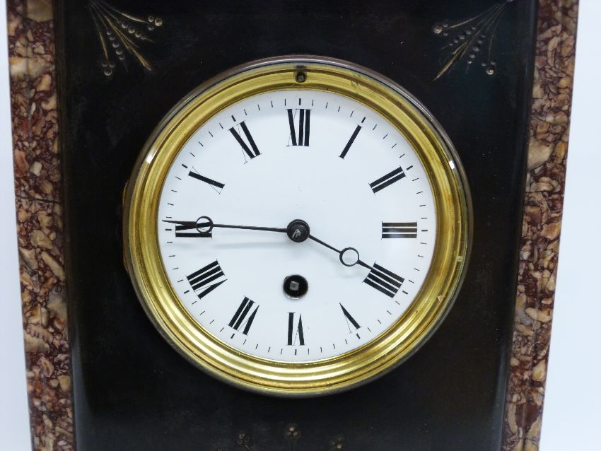 French, single train slate and marble mantel clock white enamelled Roman dial, gilt bezel and Breguet style hands, 34cm tall