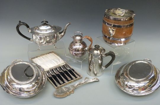 A quantity of silver plated ware to include oak biscuit barrel and serving dishes