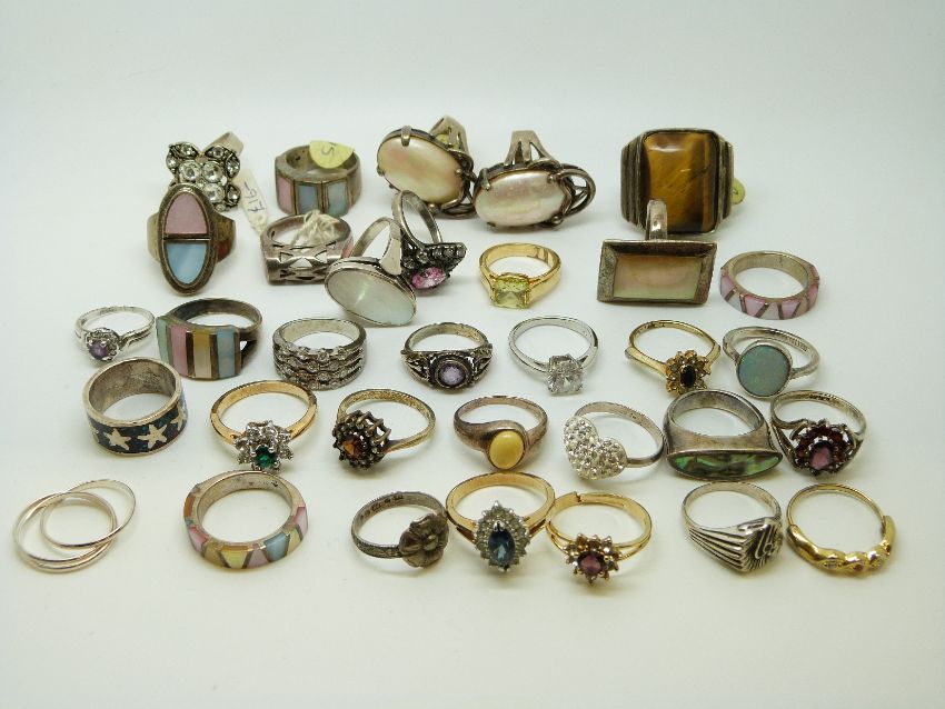 Thirty silver rings including examples set with abalone, garnet, amethysts, mother of pearl, tiger's eye etc