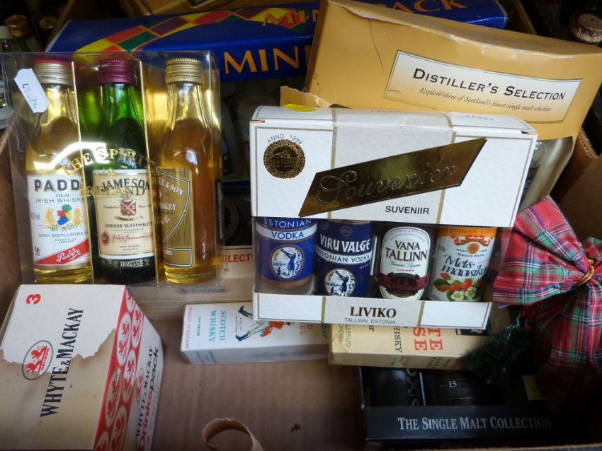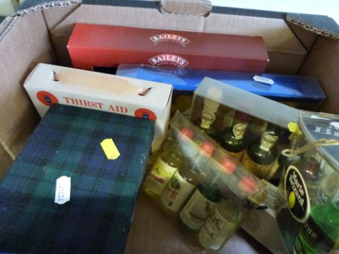 A collection of alcohol miniatures in presentation packs and boxes, including Glenmorangie whisky, Baileys, Glenfiddich, Irish whiskies, Distillers Selection, Laphroaig etc