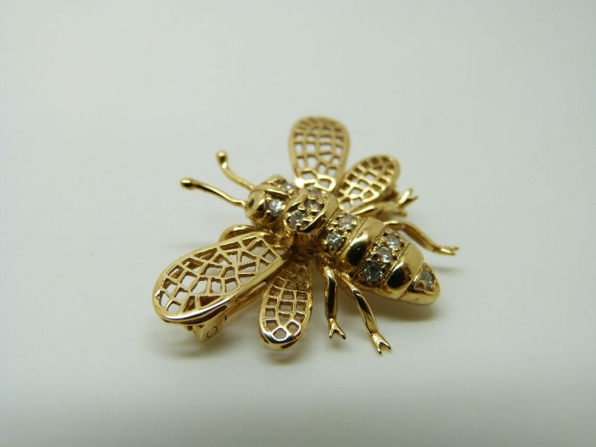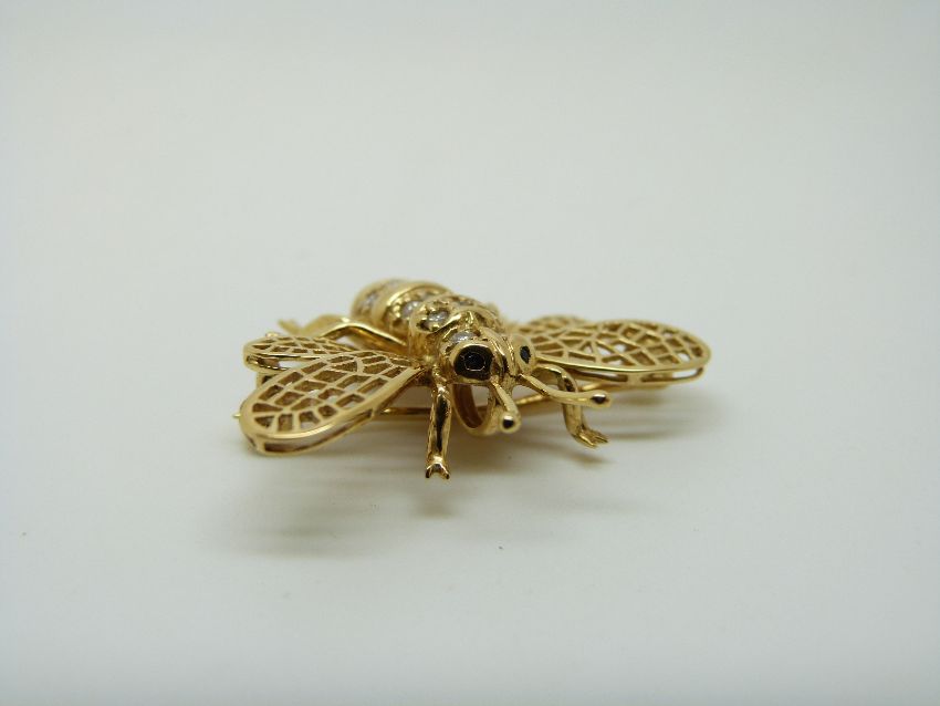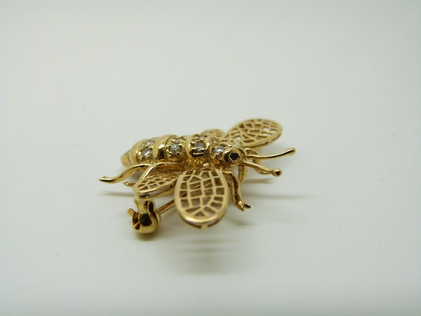 An 18ct gold brooch/ pendant in the form of an insect set with diamonds to the body, pierced wings and sapphire eyes, 3 x 2.8cm