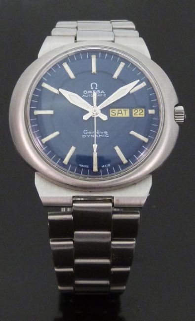 Omega Dynamic stainless steel gentleman's wristwatch with day and date apertures, luminous hands, baton markers and blue enamel face, on stainless steel bracelet, case diameter 40mm.