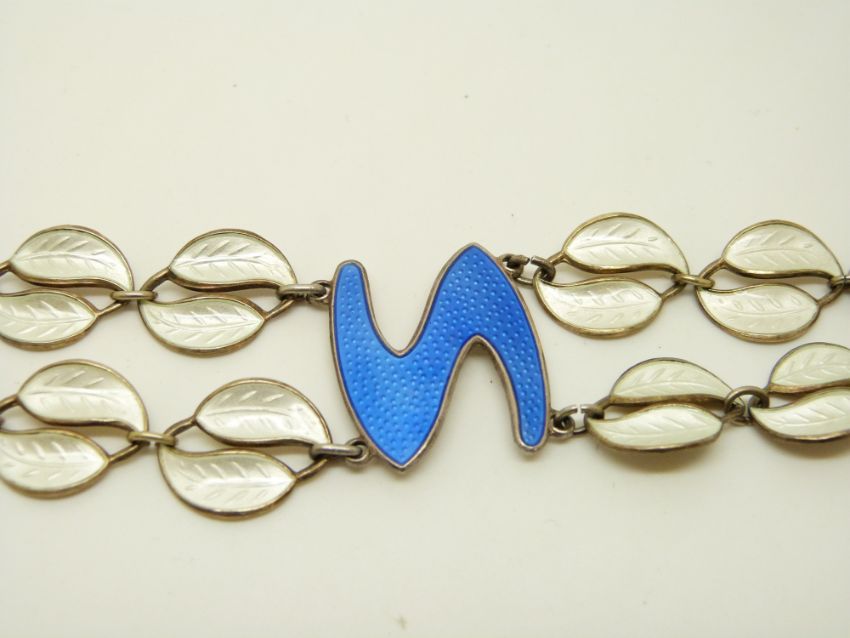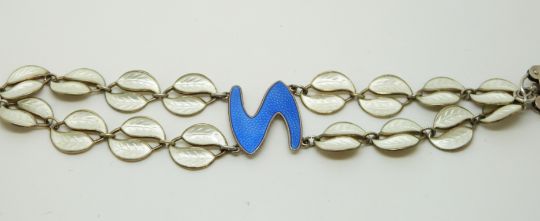 A silver bracelet of with white enamel leaves and a blue centre piece, believed to be David Andersen, Norway