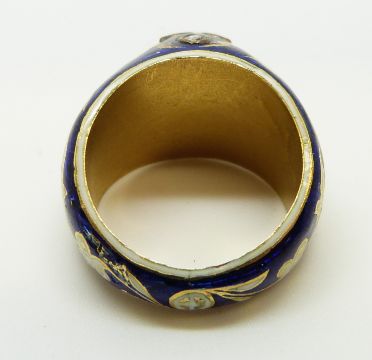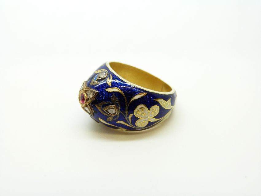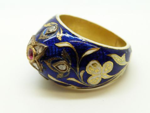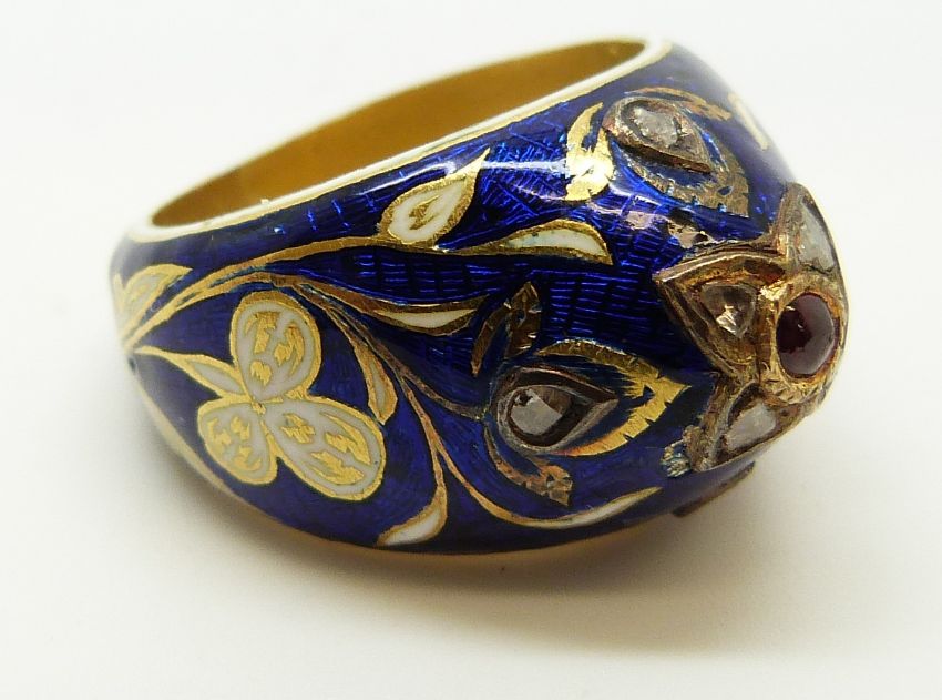 A Georgian ring, the blue enamel ground with white enamel flowers and shamrocks with gilt highlights and set with further point cut diamonds and a ruby cabochon