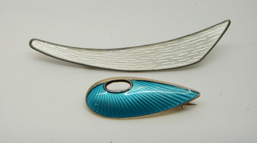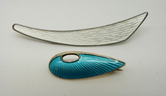 A silver brooch set with white enamel marked Norway and another similar set with blue enamel