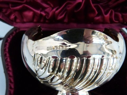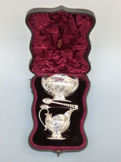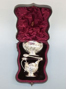 A Victorian cased hallmarked silver pedestal milk jug, sugar basin and sugar nips with wrythen shell shaped moulded decoration, Sheffield 1890 maker Atkin Brothers, 219g
