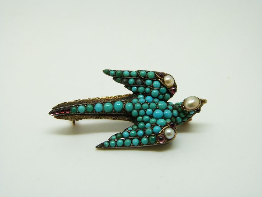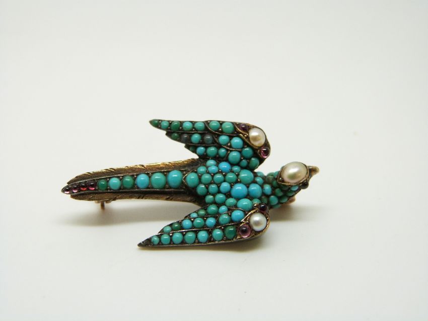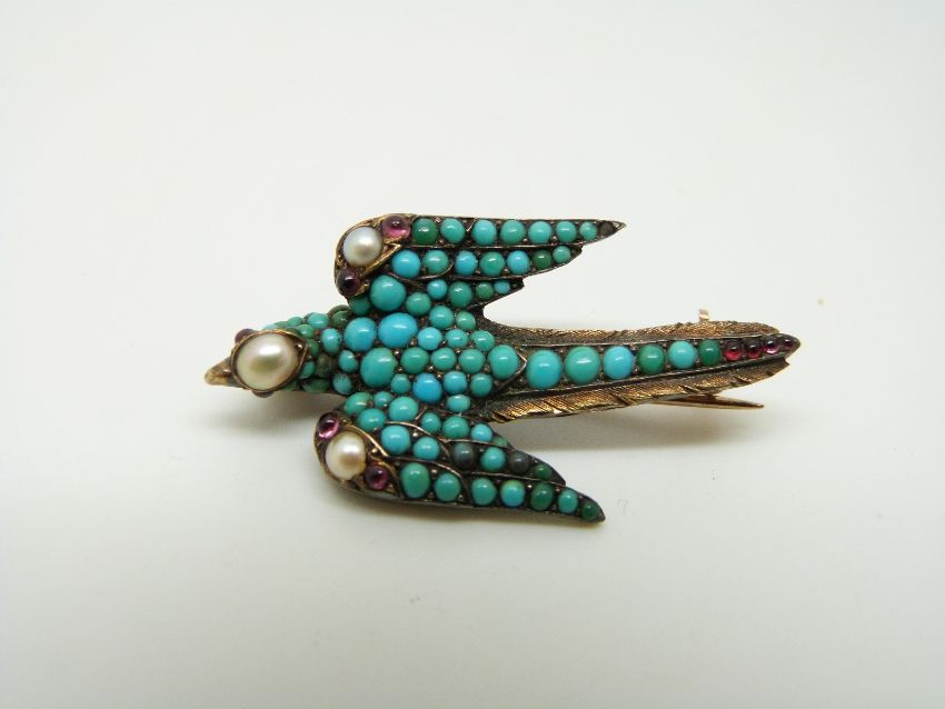 A Victorian gilt brooch in the form of a swallow set with turquoise cabochons, pearls and ruby cabochons, 3.6 x 1.9cm