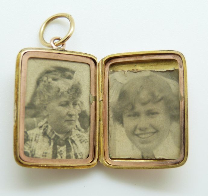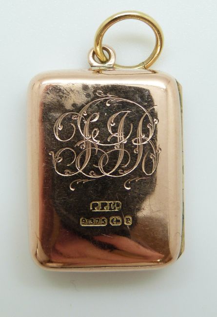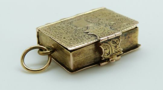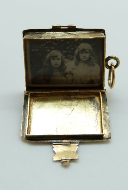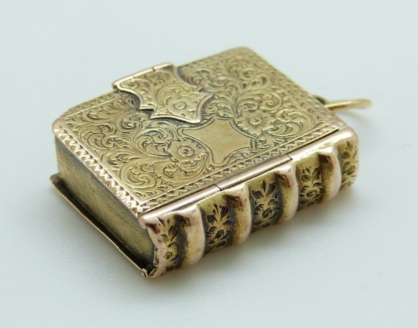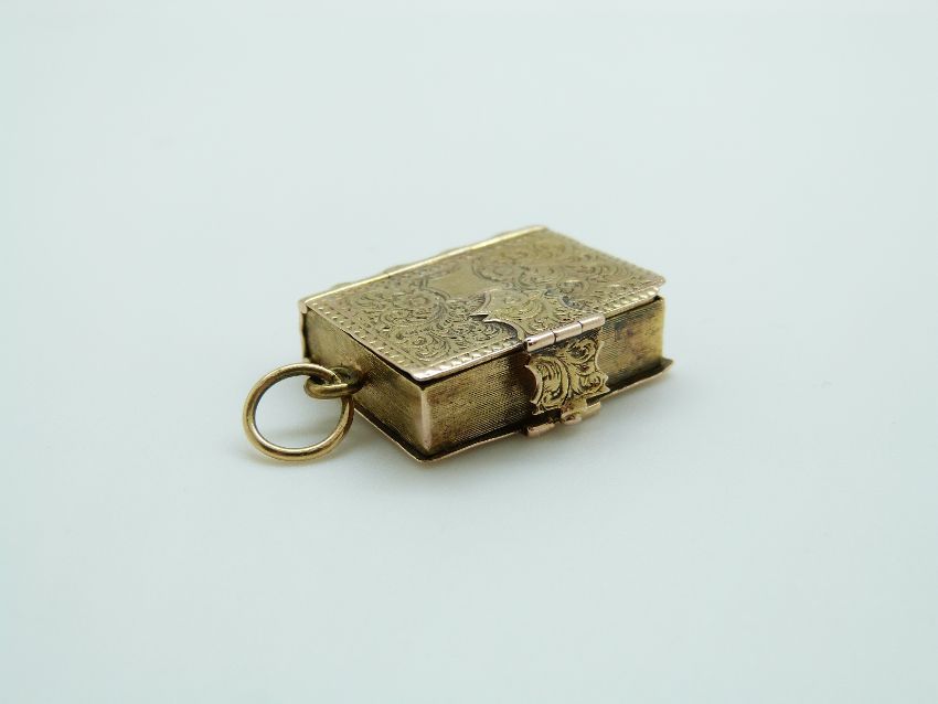 A yellow metal charm in the form of a book with chased foliate decoration and a hallmarked 9ct gold locket with chased decoration, 12.7g
