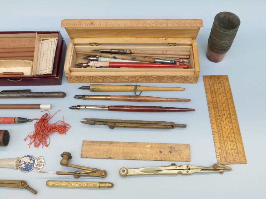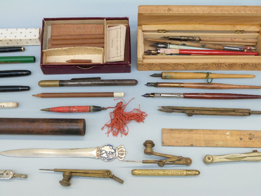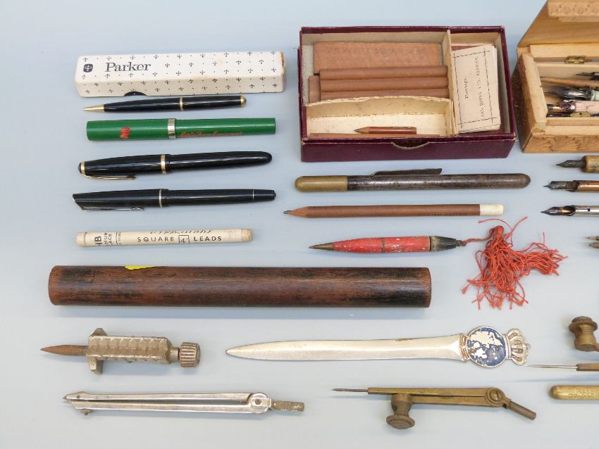 A collection of vintage pens including Parker, artist's dip pens, ephemera, nibs etc